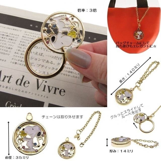 トップページルーペ ペンダントルーペ おめかしルーペ スヌーピーとウッドストック [スヌーピーSNOOPY] [倍率3][新着][母の日] 価格: ¥3,960 (税込) 販売期間: 数量: 個 現在庫数 在庫あり 返品についての詳細はこちら 便利なルーペがおしゃれに「おめかし」 チャームにすればバッグも「おめかし」 素敵なルーペを使ってあなた自身も「おめかし」 繊細で上品なすかし模様で、困ったときにサッとエレガントに使えるルーペです♪ ■生産国 CHINA■寸法(本体) W35×H140×D14ミリ レンズ径:28ミリ■素材 レンズ:ガラス,枠・チェーン:合金,真鍮,鉄,樹脂■重量(g) 58■倍率 3倍■その他仕様 スライド式 管理番号010747