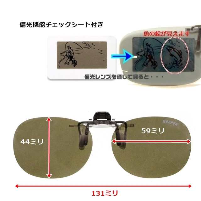 トップページサングラス CLIP ON キーパー(はね上げ)ブラウン偏光9320-01[サングラス] 価格: ¥3,850 (税込) 販売期間: 数量: 個 現在庫数 在庫あり 返品についての詳細はこちら お手持ちのめがねがワンタッチでサングラスに変身☆偏光度99%以上で邪魔なギラツキ、写り込み、反射などのまぶしさをしっかりカットします。スタイリッシュなデザインで、フルシーズン日常の様々な用途で活躍します! ■生産国 日本■寸法(本体) レンズ径:59-44-131■素材 レンズ:プラスチック(ハードコート) レンズ枠:ニッケル合金■重量(g) 10■その他仕様 偏光度:99.95%可視光線透過率:23%UVカット■付属品 偏光機能チェックシート専用ケース■ご注意 トンネル内や暗いところでのご使用は視力が低下して危険ですので、はね上げるか使用をおやめください。 管理番号410053